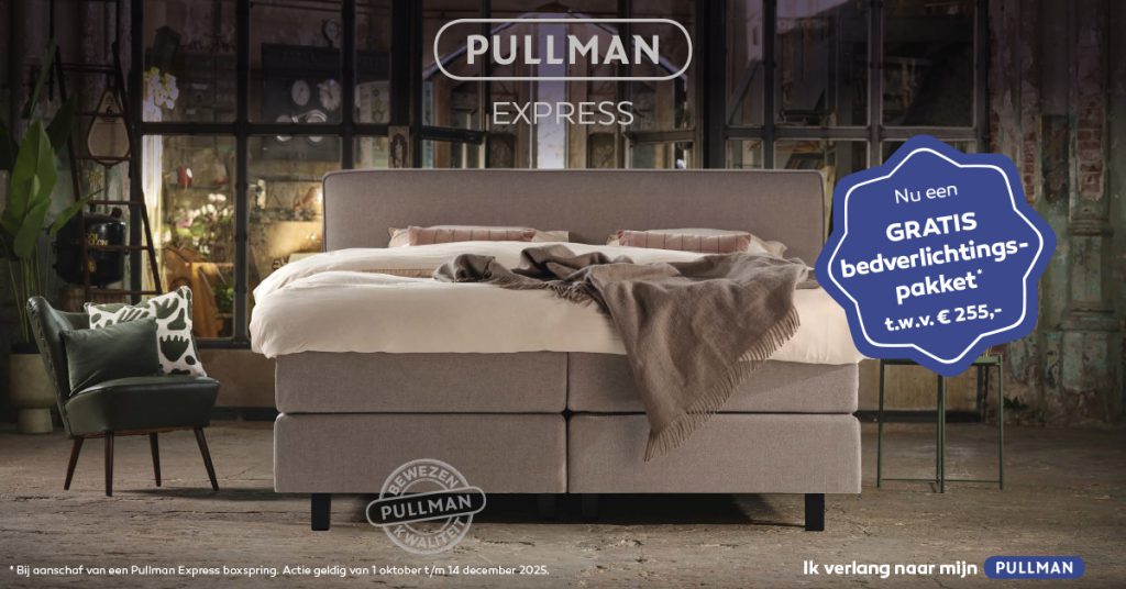 Ontvang een gratis bedverlichtingspakket t.w.v. € 255,- bij aanschaf van een complete Pullman Express combinatie. Actie is geldig t/m 14 december 2025. Actievoorwaarden: Actie is geldig t/m 14 december 2025. De actie is geldig bij aanschaf van een complete tweepersoons boxspringcombinatie Express, bestaande uit twee boxsprings inclusief poten, hoofdbord, twee matrassen en een comforttopper.