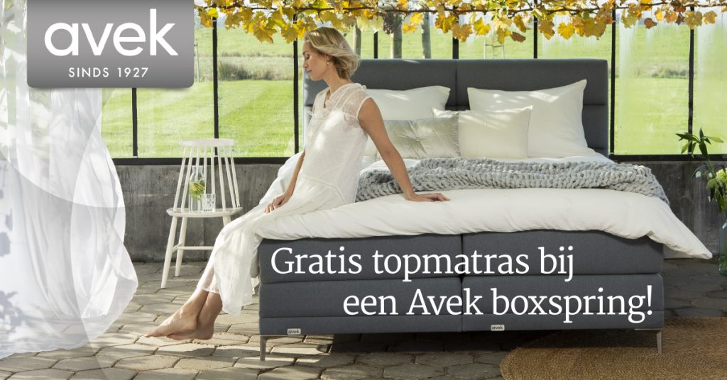 Profiteer van zomervoordeel op Avek. De comfortabele Avek boxsprings zijn nu extra aantrekkelijk. Je ontvangt gratis een luxe topmatras bij aankoop van een complete 2-persoons Boxspring Noflik, Boxspring Simmer, Boxspring Fier of de elektrische Boxspring 1927. Op de vaste Boxspring 1927 ontvang je € 300,- korting (i.p.v. een gratis topmatras). Deze actie is geldig in de periode van 1 augustus tot en met 5 september 2022.