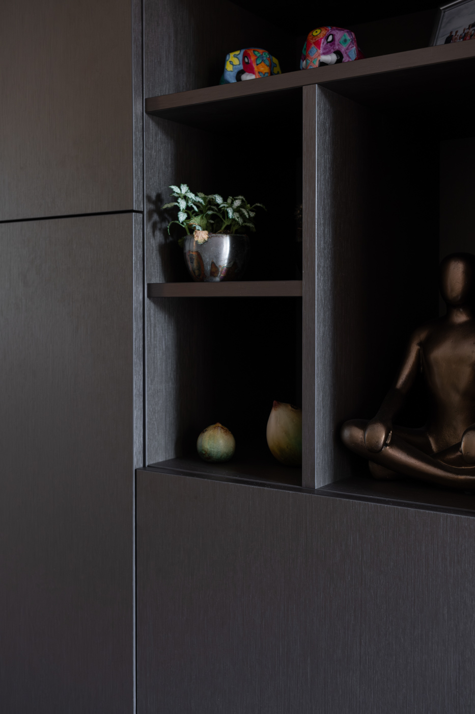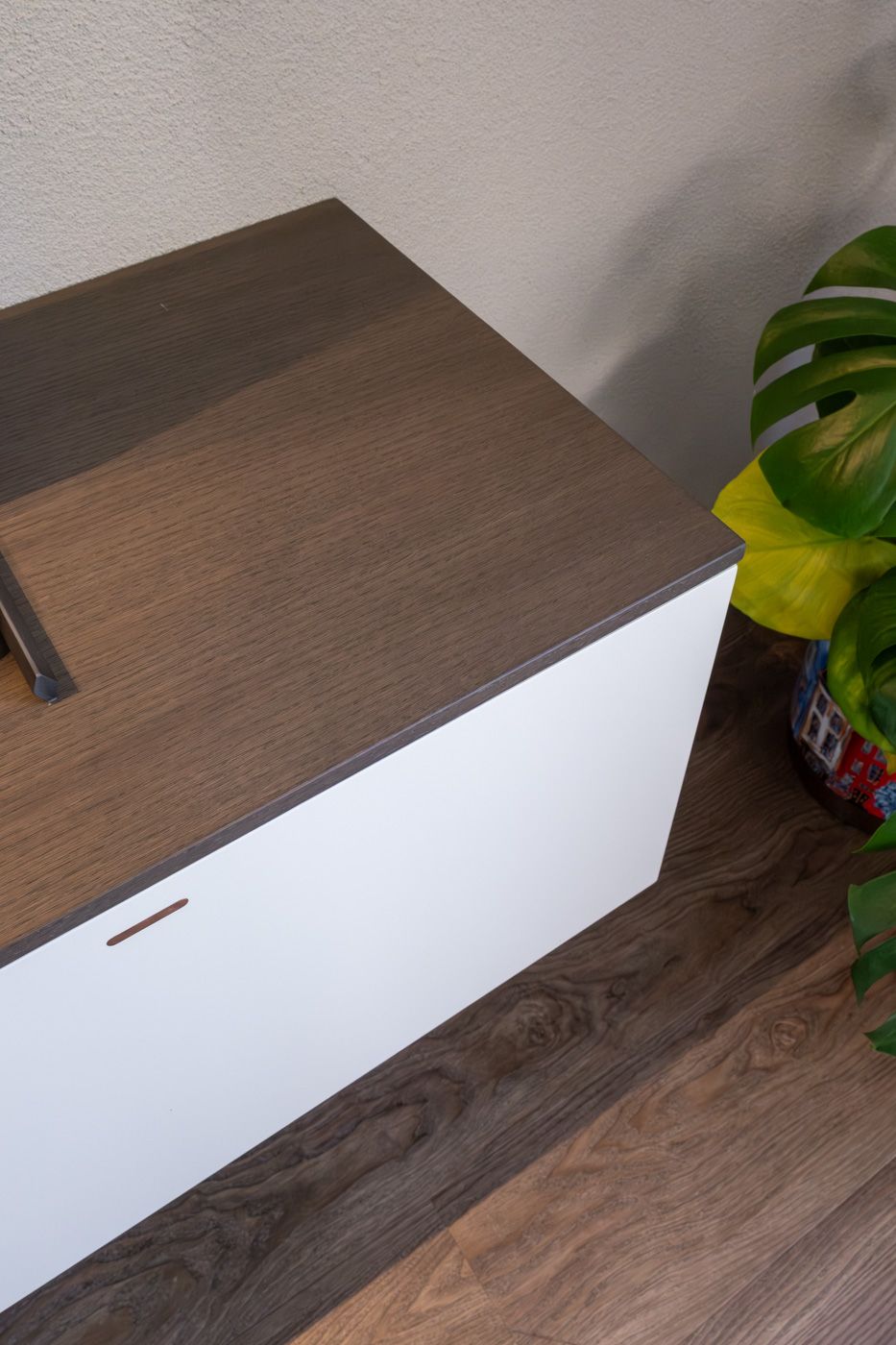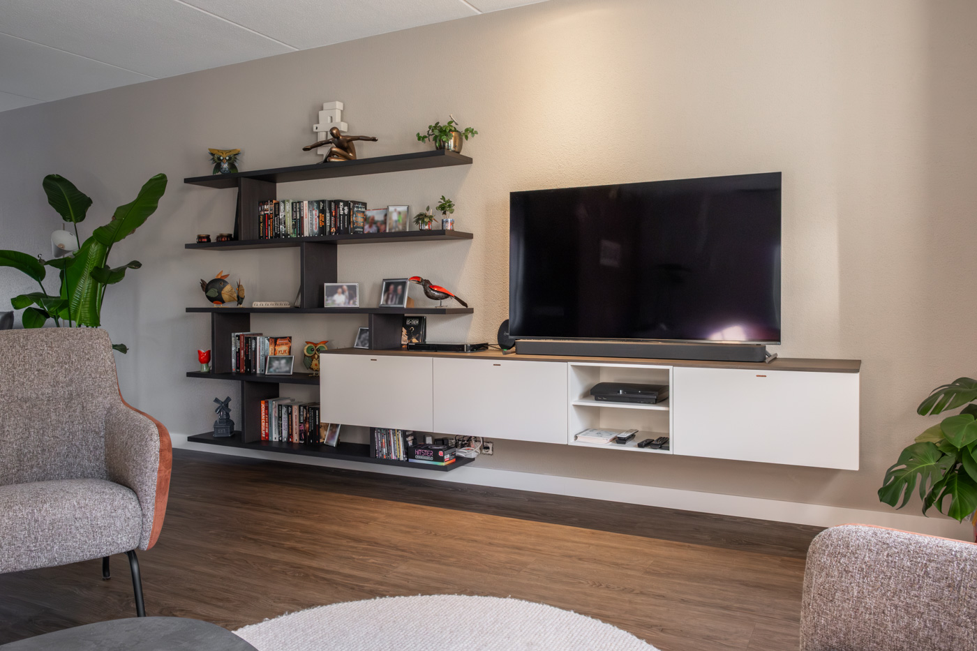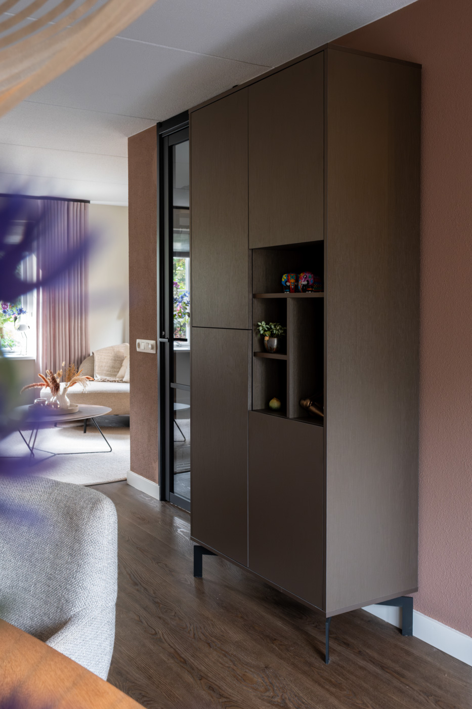 Een wandmeubel van Interstar om persoonlijke herinneringen een mooie plek te geven. Richting de eetkamer staat een warme kleur kast van Van der Drift. Praktisch en een mooie uitstraling.