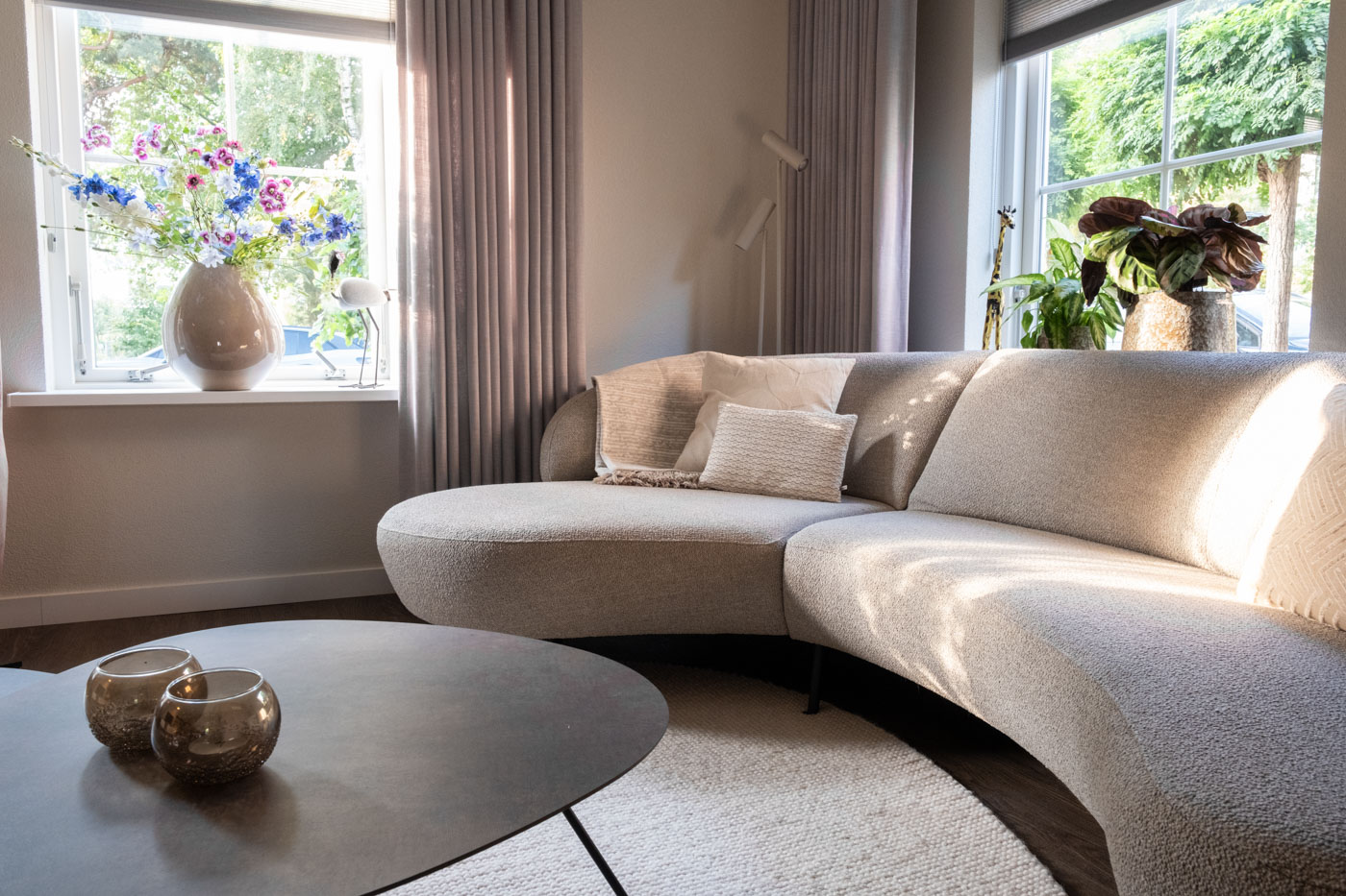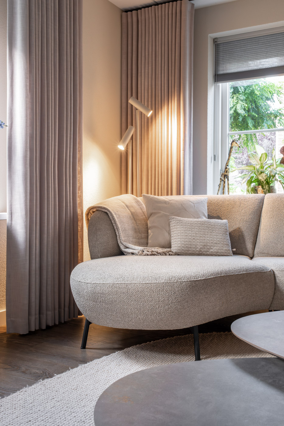 Naast de gordijnen is ook gekozen voor Plissé shades voor de privacy en het daglicht te reguleren. Een mooie keuze om overdag en in de avond altijd een gezellige sfeer in huis te creëren.