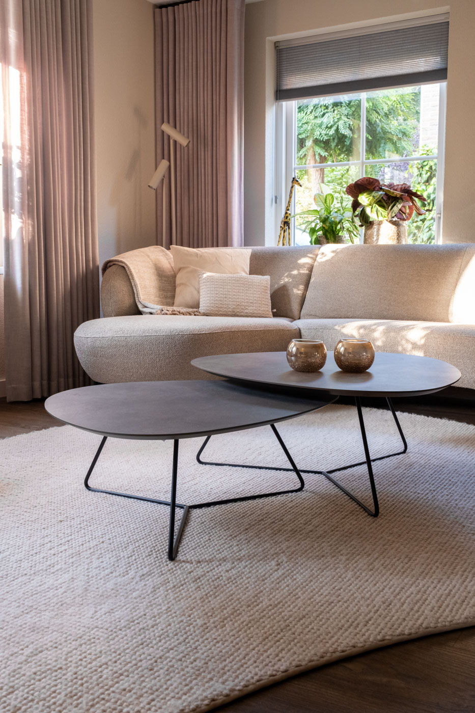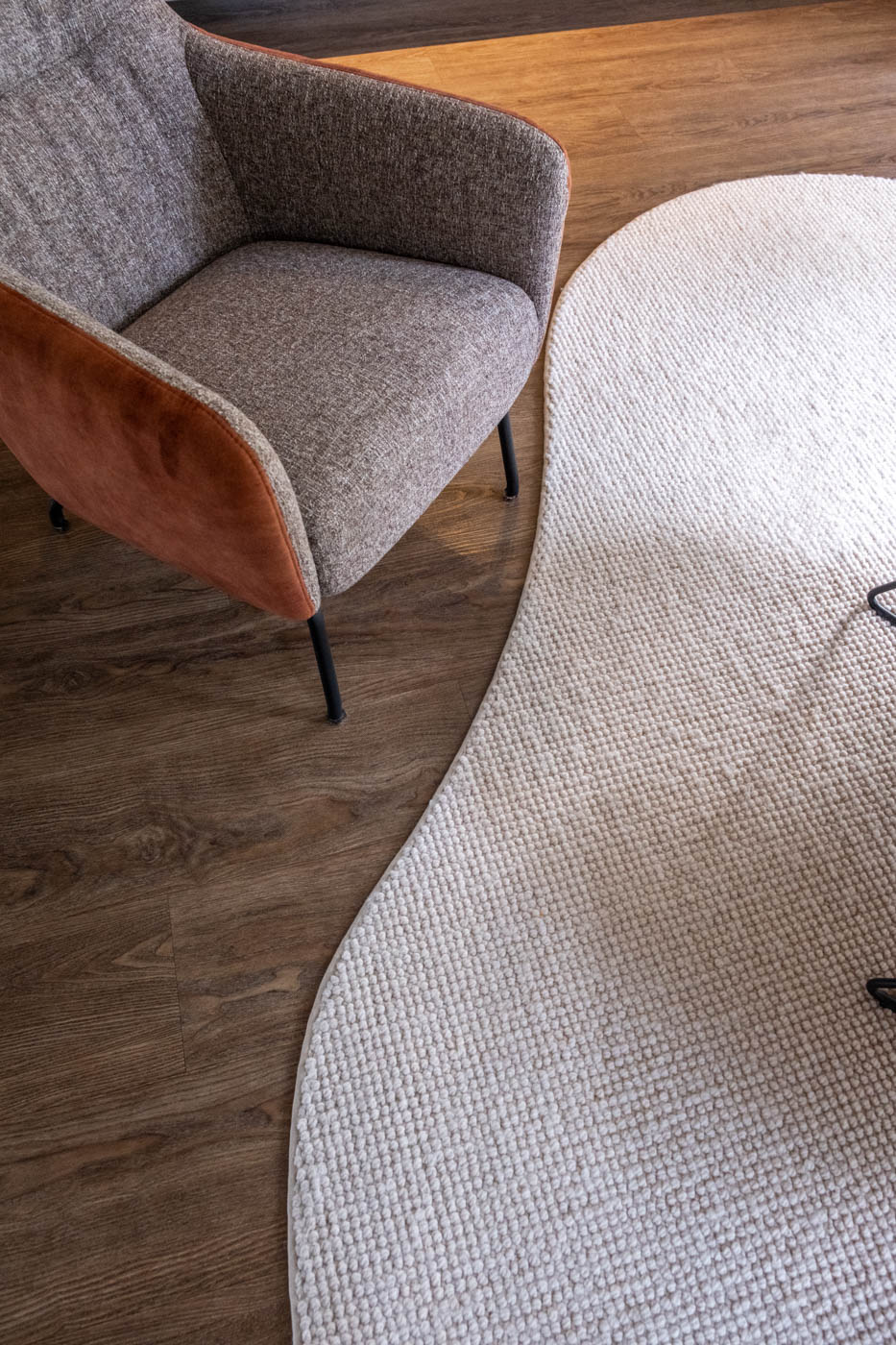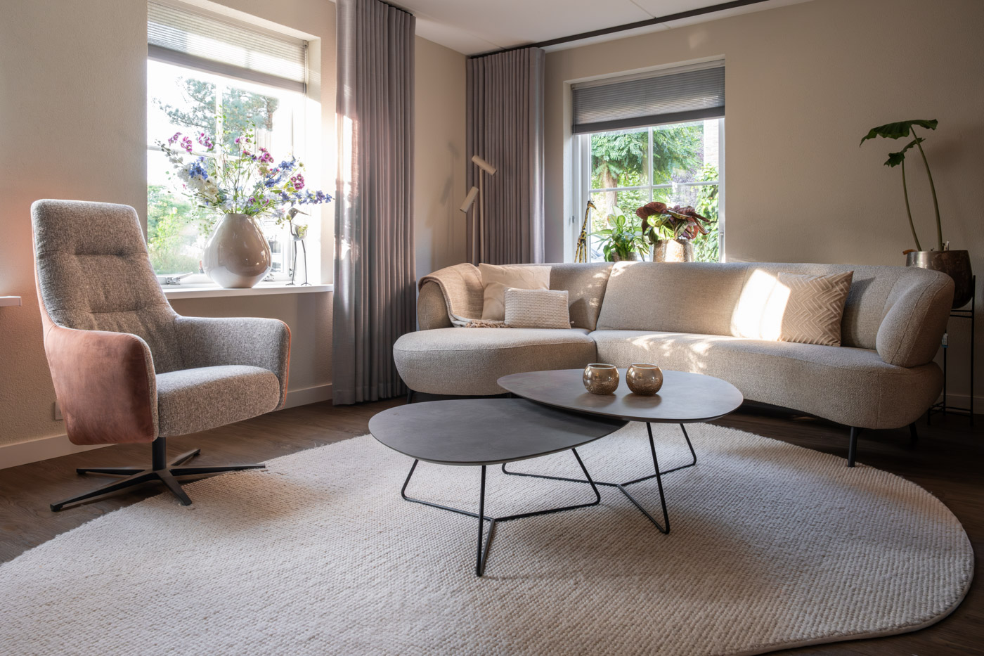 De woning heeft een compleet nieuw interieur gekregen. Voor alle meubels is gekozen voor lichte kleuren zodat in accessoires meer met kleur gewerkt kan worden. Een groot organisch vloerkleed verbindt de fauteuil en bank met elkaar. De organische vorm komt ook weer terug in de Twinny salontafels van Bree’s New World.