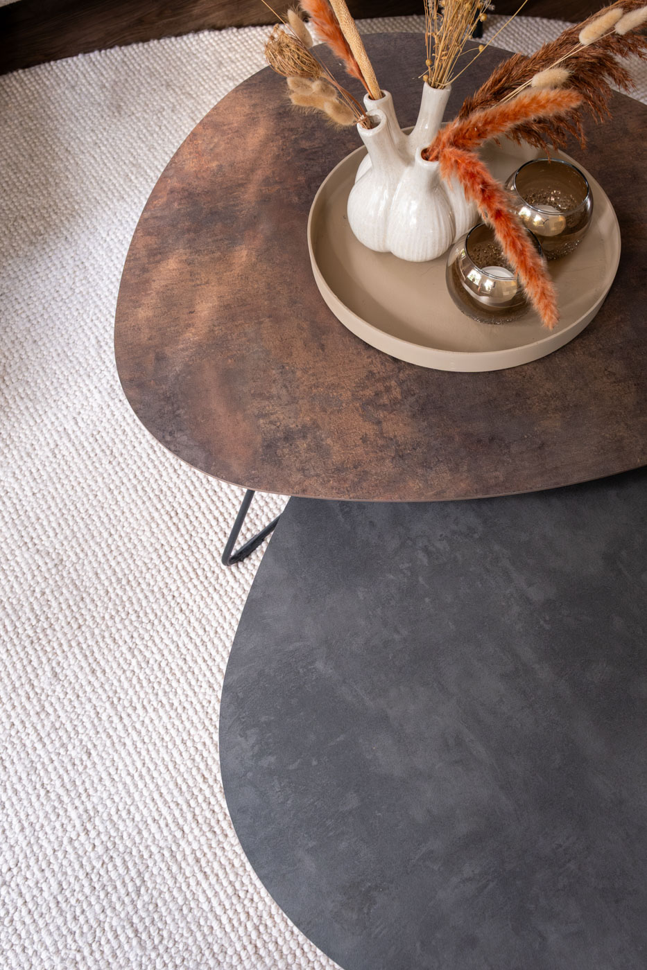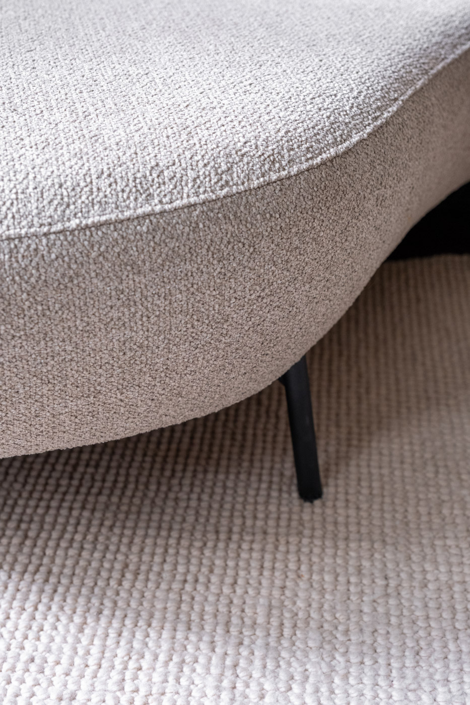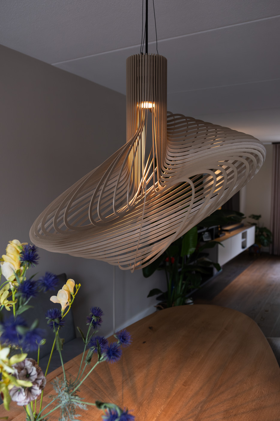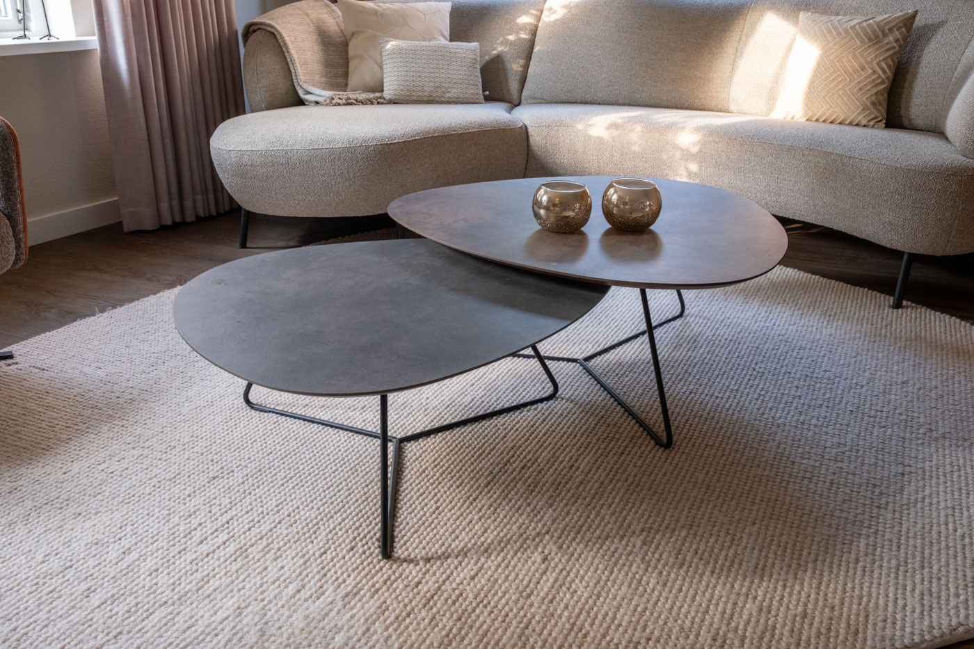 De woning heeft een compleet nieuw interieur gekregen. Voor alle meubels is gekozen voor lichte kleuren zodat in accessoires meer met kleur gewerkt kan worden. Een groot organisch vloerkleed verbindt de fauteuil en bank met elkaar. De organische vorm komt ook weer terug in de Twinny salontafels van Bree’s New World.