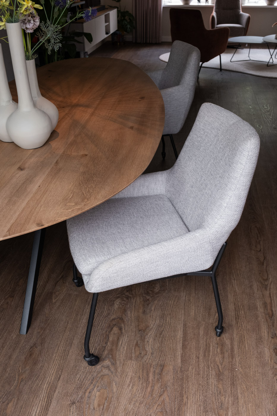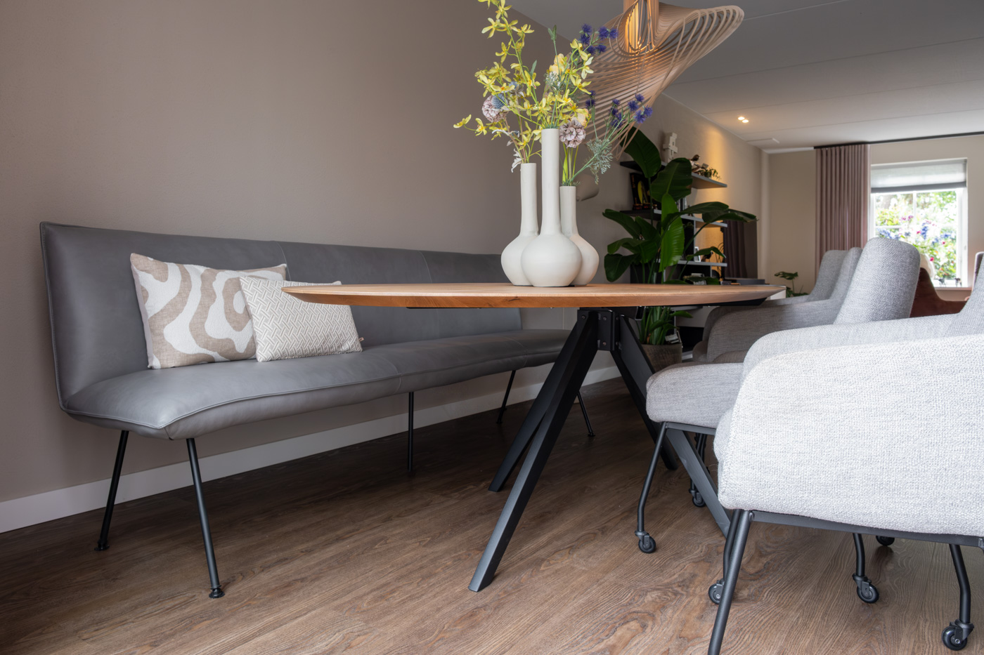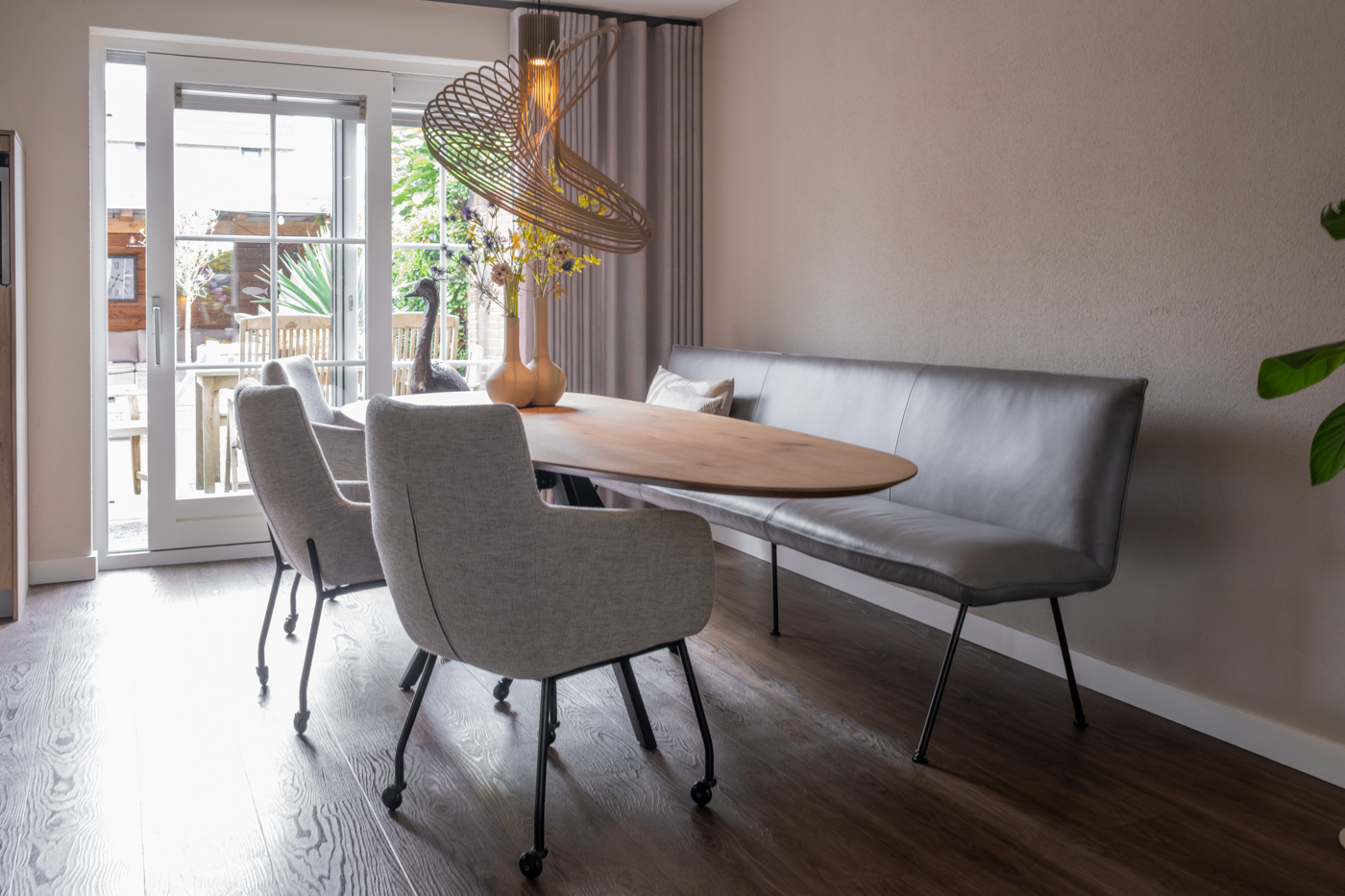 Ook de eetkamertafel is in een organische kiezelvorm samengesteld. Op deze manier is er eenheid gecreëerd en worden beide leefruimtes met elkaar verbonden. De eetkamerstoelen zijn afgewisseld met en zonder armleuning. Aan de muurzijde is gekozen voor een eetkamerbank om ruimte aan de andere zijde te houden.
