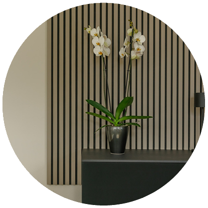 Achter het tv-meubel zijn Woodupp panelen in de kleur Stone geplaatst. Dit brengt extra sfeer in de woonkamer en draagt bij aan een goede akoestiek in de woning. We laten je in de winkel graag de mogelijkheden zien.