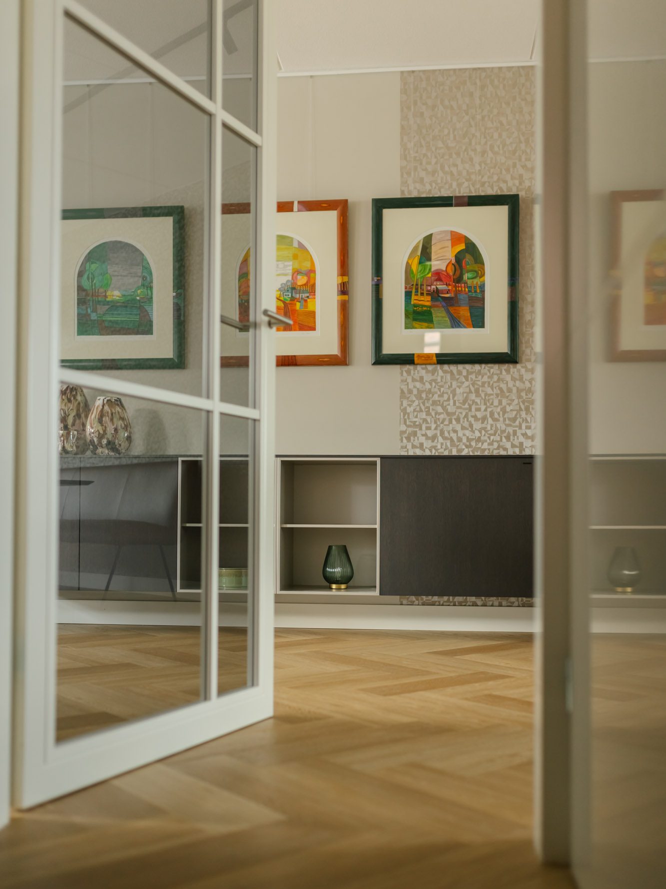 Als je de woning binnenkomt dan vallen gelijk de vier kleurrijke schilderijen op. De schilderijen hebben voor de klant een speciale betekenis. Zo kijken we altijd naar de persoonlijke elementen in het interieurontwerp. Deze eyecatchers waren dan ook het uitgangspunt van het ontwerp van de woon- en eetkamer. Om de verbinding te maken tussen de twee ruimtes is een Interstar dressoir van bijna 3,5 meter onder de schilderijen geplaatst. De kleuren van het meubel zijn rustig en afgestemd op het behang. De schilderijen komen hierdoor prachtig uit.